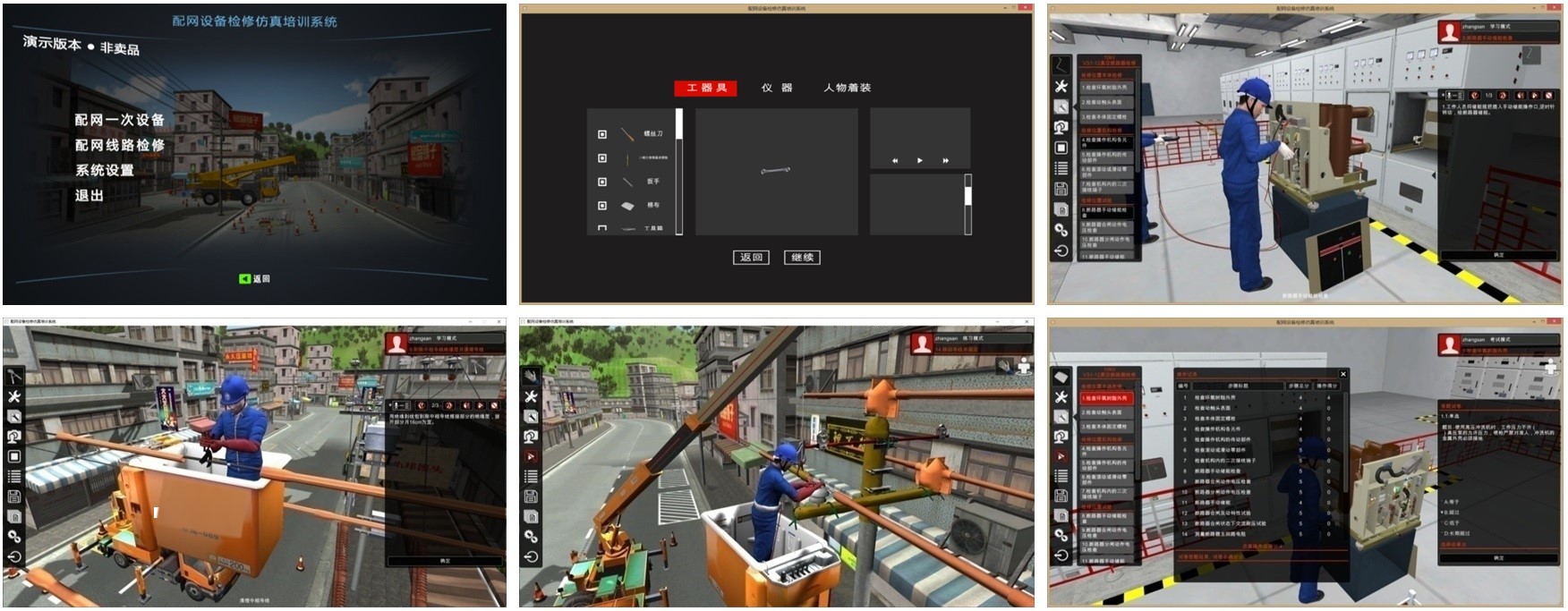 “配電網(wǎng)帶電作業(yè)仿真系統(tǒng)”通過三維虛擬仿真技術(shù),將配網(wǎng)一次設(shè)備檢修、配電線路檢修過程中涉及的標(biāo)準(zhǔn)化作業(yè)流程、檢修工藝及危險(xiǎn)點(diǎn)進(jìn)行全方位、全角度、全細(xì)節(jié)的展示,實(shí)現(xiàn)配電網(wǎng)全過程仿真模擬,其業(yè)務(wù)模塊實(shí)現(xiàn)自我學(xué)習(xí)、模擬演練、在線考試、培訓(xùn)工作管理等功能。